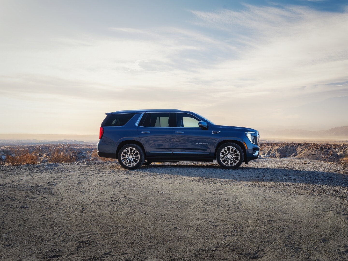 The Yukon's exterior commands attention with its bold grille, sleek lines, and distinctive C-shaped LED signature lighting. Available 22-inch wheels add to its imposing stance. Inside, the spacious cabin features premium materials and meticulous craftsmanship. With seating for up to nine passengers and generous cargo space, the Yukon is ready for any adventure.